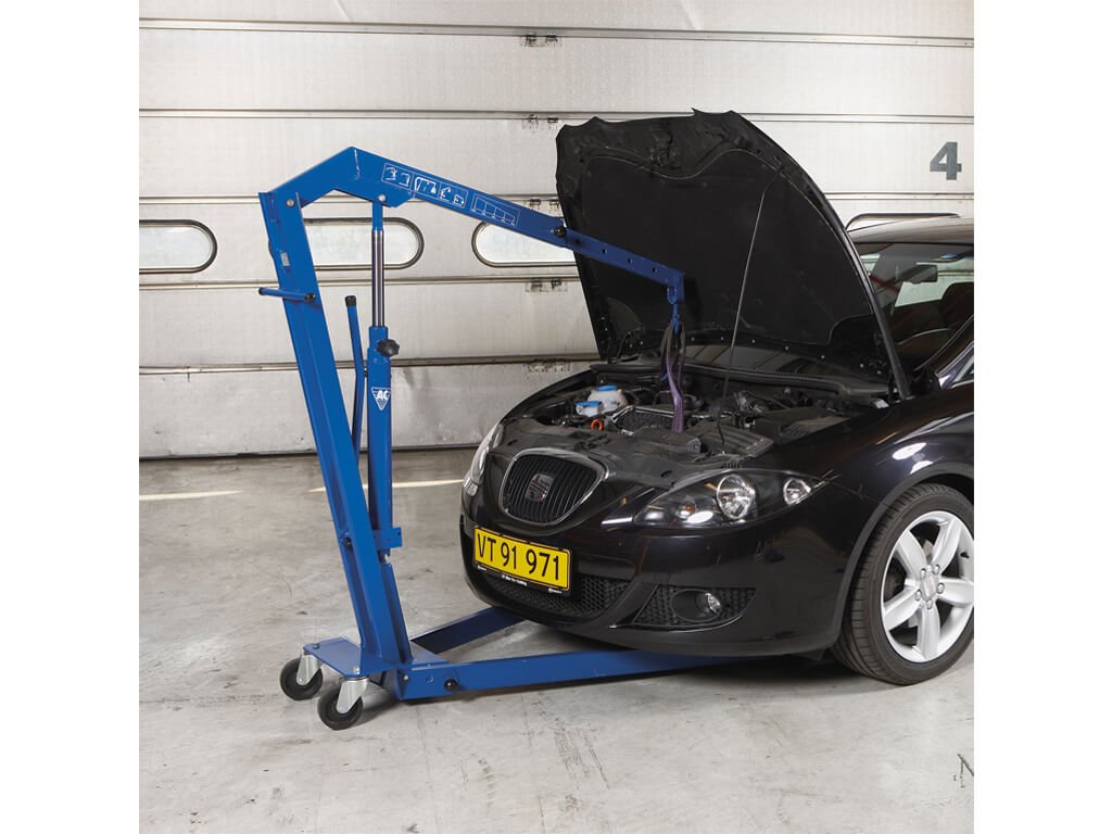 Mobilní hydraulický dílenský jeřáb (často nazývaný jako žirafa) WJN10 od dánského výrobce AC HYDRAULIC s hákem otočným o 360° a o nosnosti 1 100 kg.