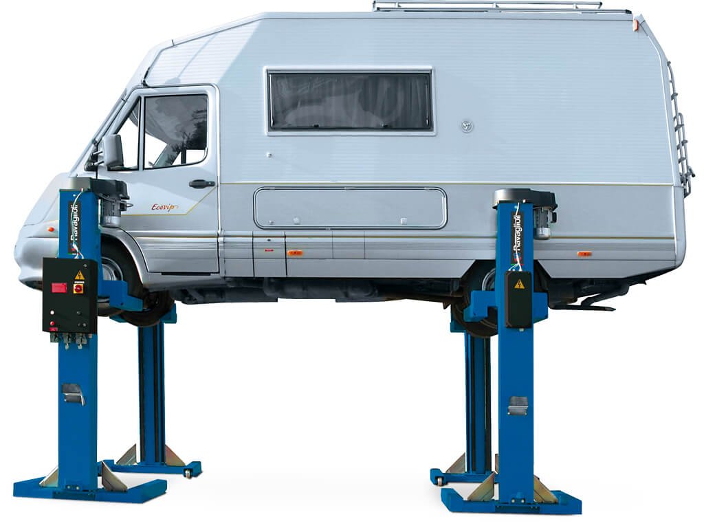 Elektromechanické mobilní sloupové hevery pro užitková vozidla a mobilní domy. Šrouby jsou automaticky mazány při pohybu nahoru dolu, sloupy z pevné oceli. Každý sloup je vybaven kolečky pro snadnou manipulaci po hladkých plochách. Na každém sloupu je elektrický motor pro zajištění pohybu šroubovice.