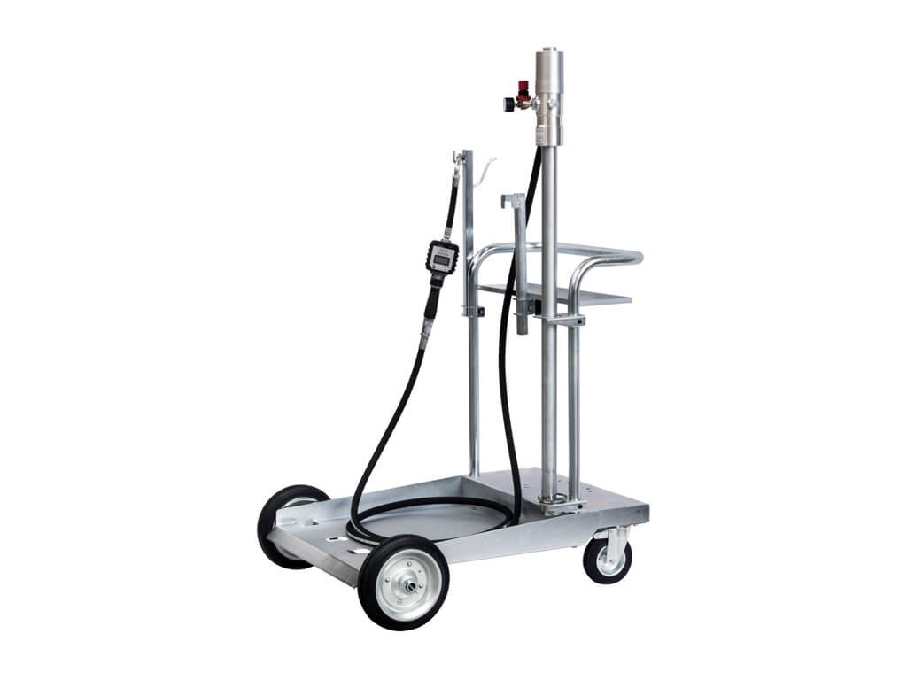 Sada se standardním vozíkem, pneumatickým čerpadlem 3:1 pro 200litrový sud s upevňovacím kroužkem, hadicí a výdejní pistolí s digitálním průtokoměrem. Sada je dodávaná s regulátorem tlaku, který se připojuje k čerpadlu.