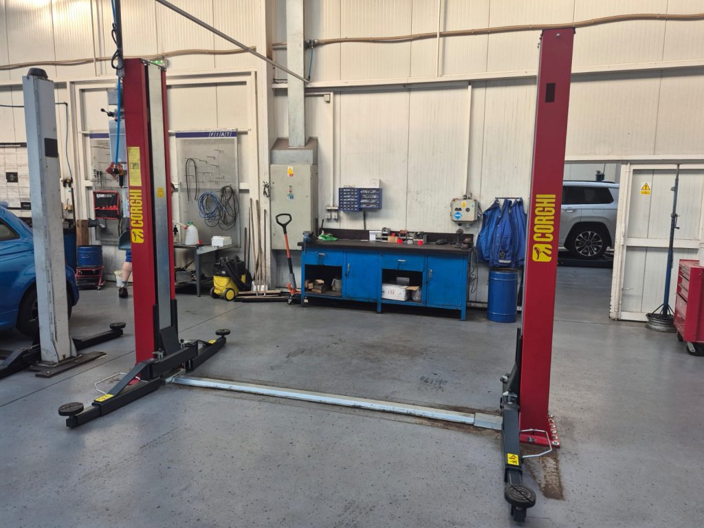 Jedná se o použitý dvousloupový elektro-hydraulický zvedák s přejezdem (nosnost 3 200 kg) od italského výrobce CORGHI (NEXION S.p.A.).
