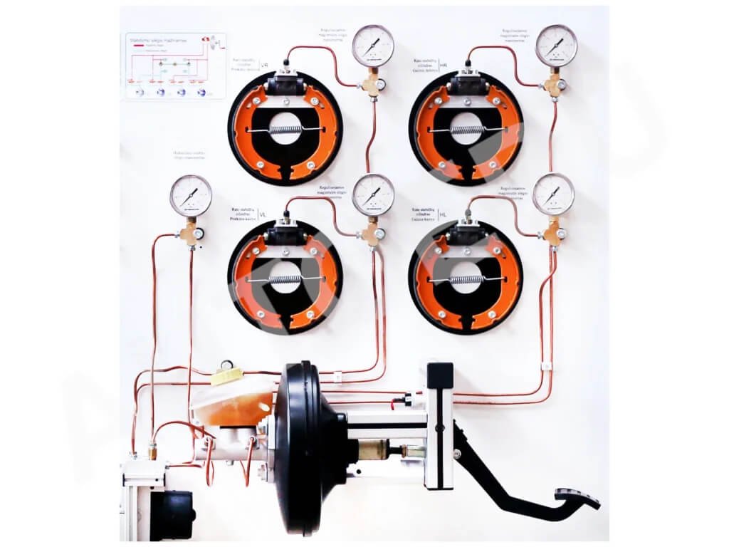 - Originální hydraulický brzdový systém. Brzdové destičky brzdových bubnů se používají místo brzdových kotoučů k demonstraci, kdy stoupá tlak a začíná brzdný moment.