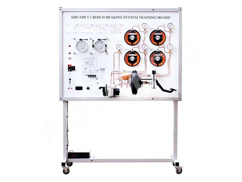 Plně funkční elektronický simulátor ABS/ASR elektronického brzdového systému je instalován v mobilním hliníkovém rámu. Tento simulátor tréninkové desky je speciálně navržen tak, aby demonstroval brzdný systém ABS/ASR a provozní strukturu. Výuková tabule je založena na OEM komponentech Audi/VW a je vybavena funkčním brzdovým systémem BOSCH 5.3 ABS/ASR a demonstruje různé provozní režimy.