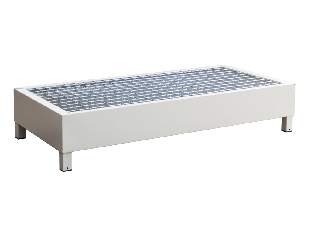 Záchytná vana je vyrobena z oceli a povrchově upravená antikorozním nátěrem. Mřížka je z pozinkované oceli. Výška těchto záchytných van je ideální pro snadné naložení a vyložení sudů / nádrží.